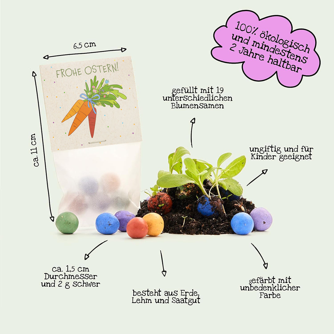 Kreatives Ostergeschenk: Enthält 10 im Osterdesign gestaltete Tütchen, gefüllt mit je 5 bunten Saatkugeln, aus denen Wildblumen wachsen. Das ideale Ostergeschenk für Kinder, Freunde und Kollegen, auch eine tolle Zugabe zum Osternest.