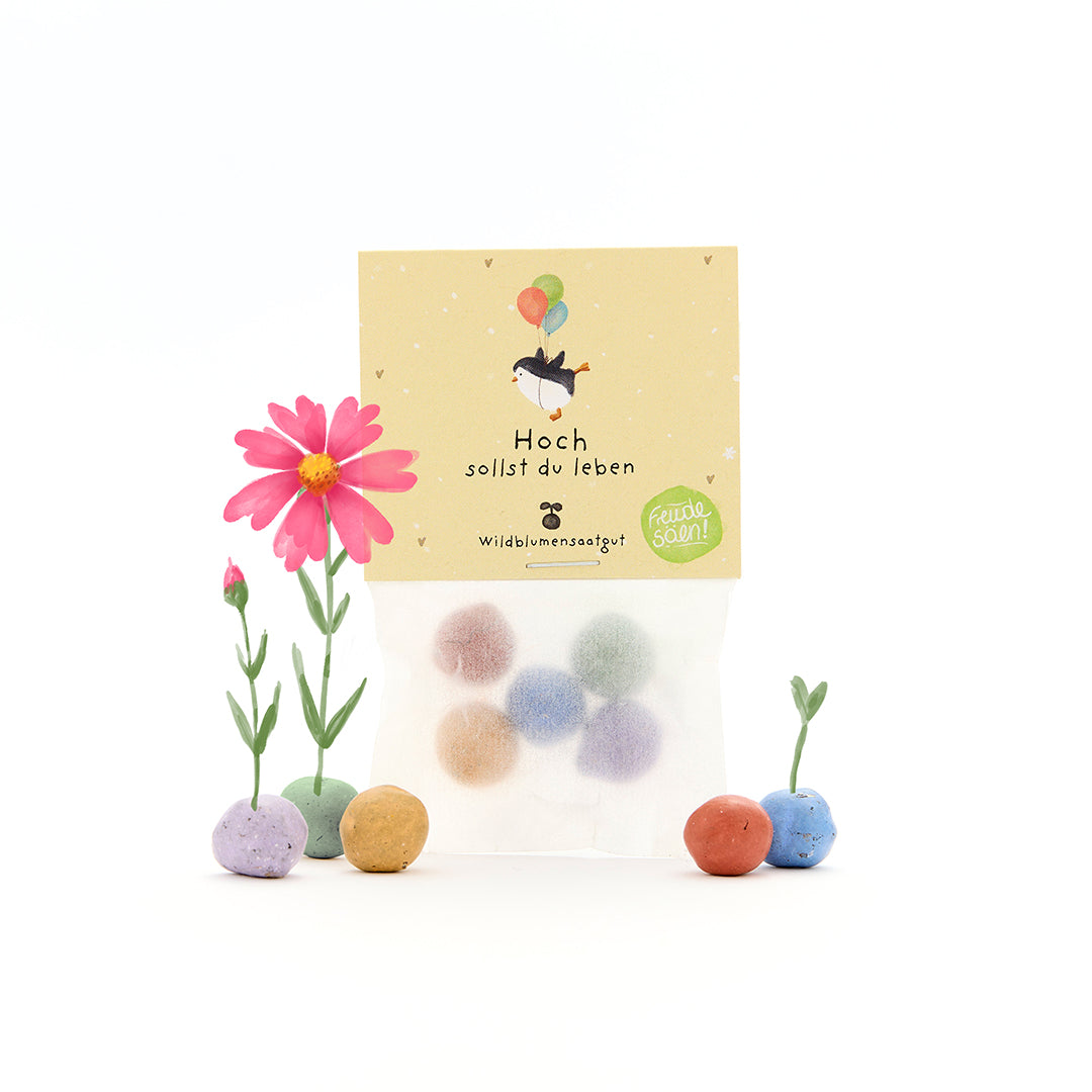Tolles Geschenk zum Geburtstag: Dieses Set enthält ein liebevoll gestaltete Tütchen mit 5 bunten Blumenmurmeln. Mit dem Spruch "Hoch sollst du leben" perfekt als kleine, spontane Geburtstagsüberraschung und Mitbringsel zur Geburtstagsparty.
