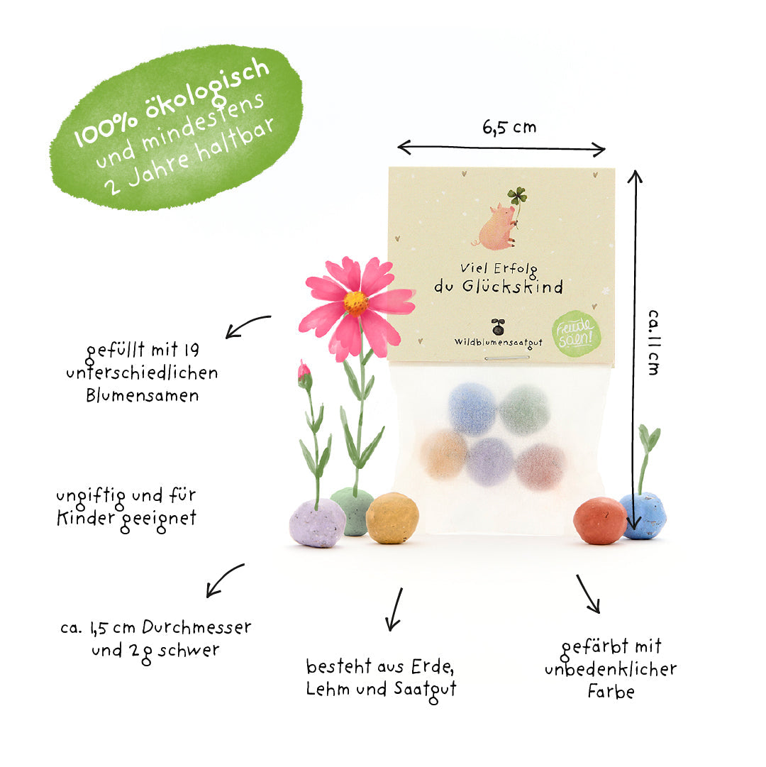 Glücksgruß mit Herz & Kleeblatt: Dieses Set enthält ein liebevoll gestaltetes Tütchen mit 5 bunten Blumenmurmeln und der fröhlichen Aufschrift „Viel Erfolg du Glückskind“. Mit Glücksschwein und Kleeblatt ist jedes Tütchen ein zauberhafter Glücksbringer – ideal, um Mut zu machen und Erfolg zu wünschen.