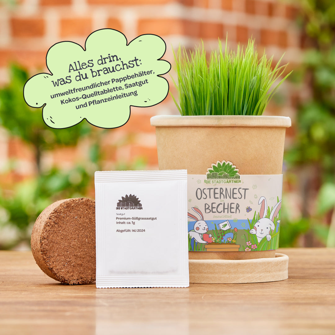 Alles drin: Der umweltfreundliche Anzuchtbecher enthält eine Kokos-Quelltablette und hochwertiges Ostergras-Saatgut. Perfekt für Balkon, Garten oder Fensterbank – kinderleichte Anwendung und ein schönes Naturerlebnis für Groß und Klein.