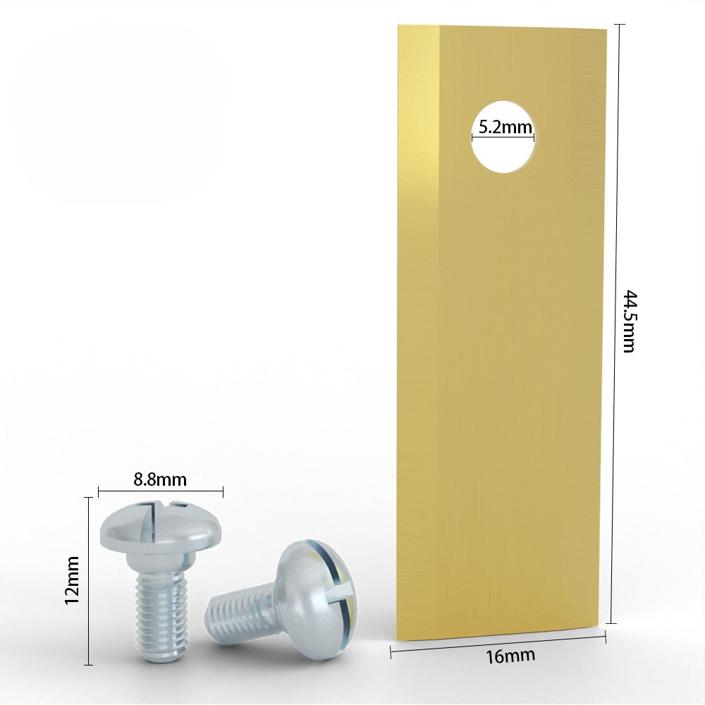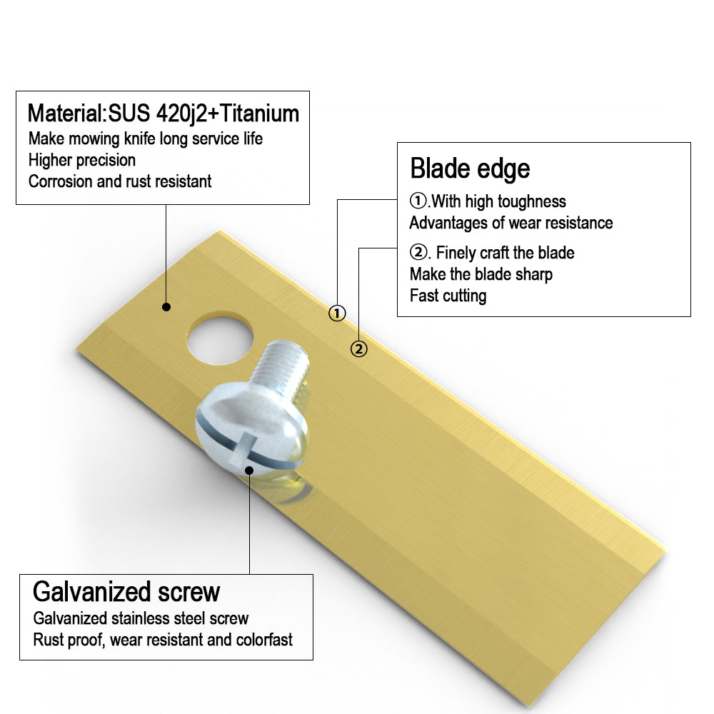 Hochwertige Titan-Ersatzklingen (Edelstahl Titancarbid (TiC) beschichtet) für Stiga A & G Modelle. Langlebig und scharf – perfekte Leistung, einfache Montage. Diese Messer sorgen für eine längere Lebensdauer, längere Standzeit und hervorragende Schneidleistung. Der Messersatz beinhaltet Befestigungsschrauben.