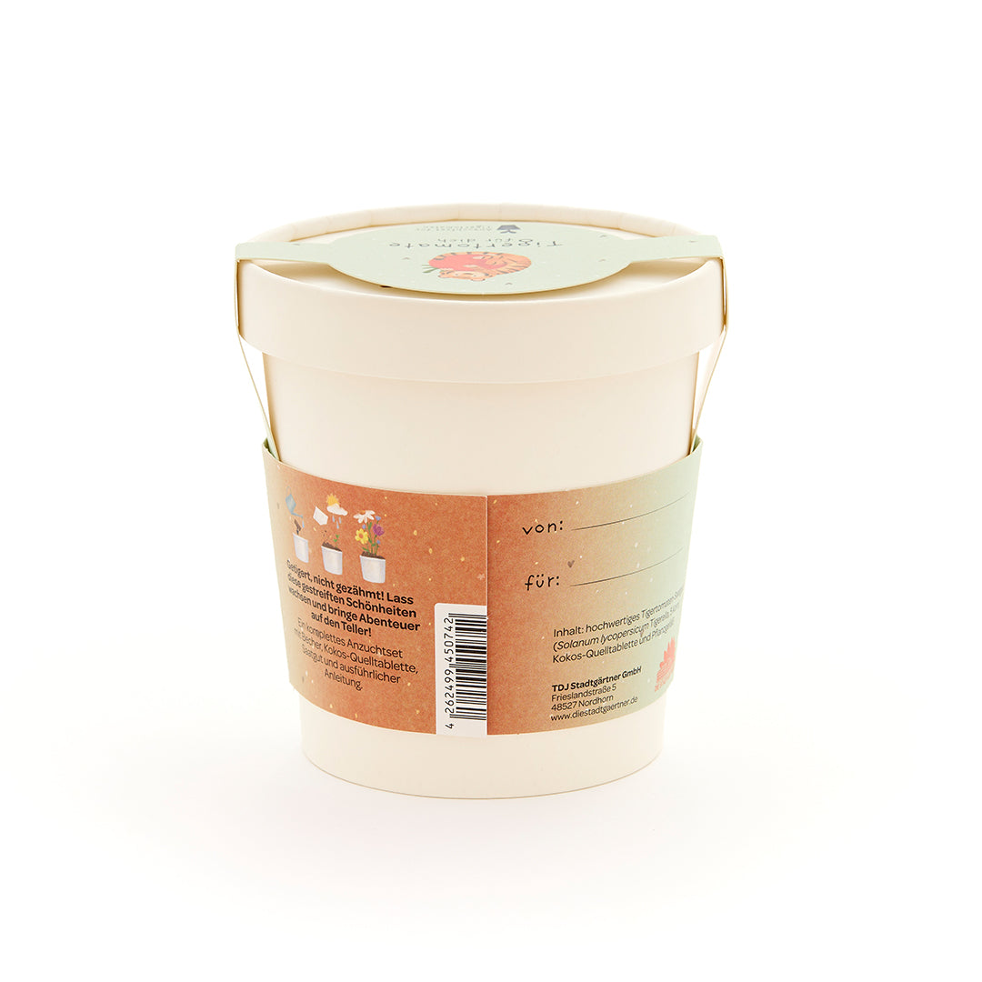 Alles drin für gestreifte Tomatenliebe: Das Set enthält Tigertomaten-Saatgut, eine Kokos-Quelltablette, einen Anzuchtbecher und eine Anleitung. In nur wenigen Schritten wächst aus dem Set ein fruchtiger Pflanzengruß – auf der Fensterbank, im Büro oder auf dem Balkon.