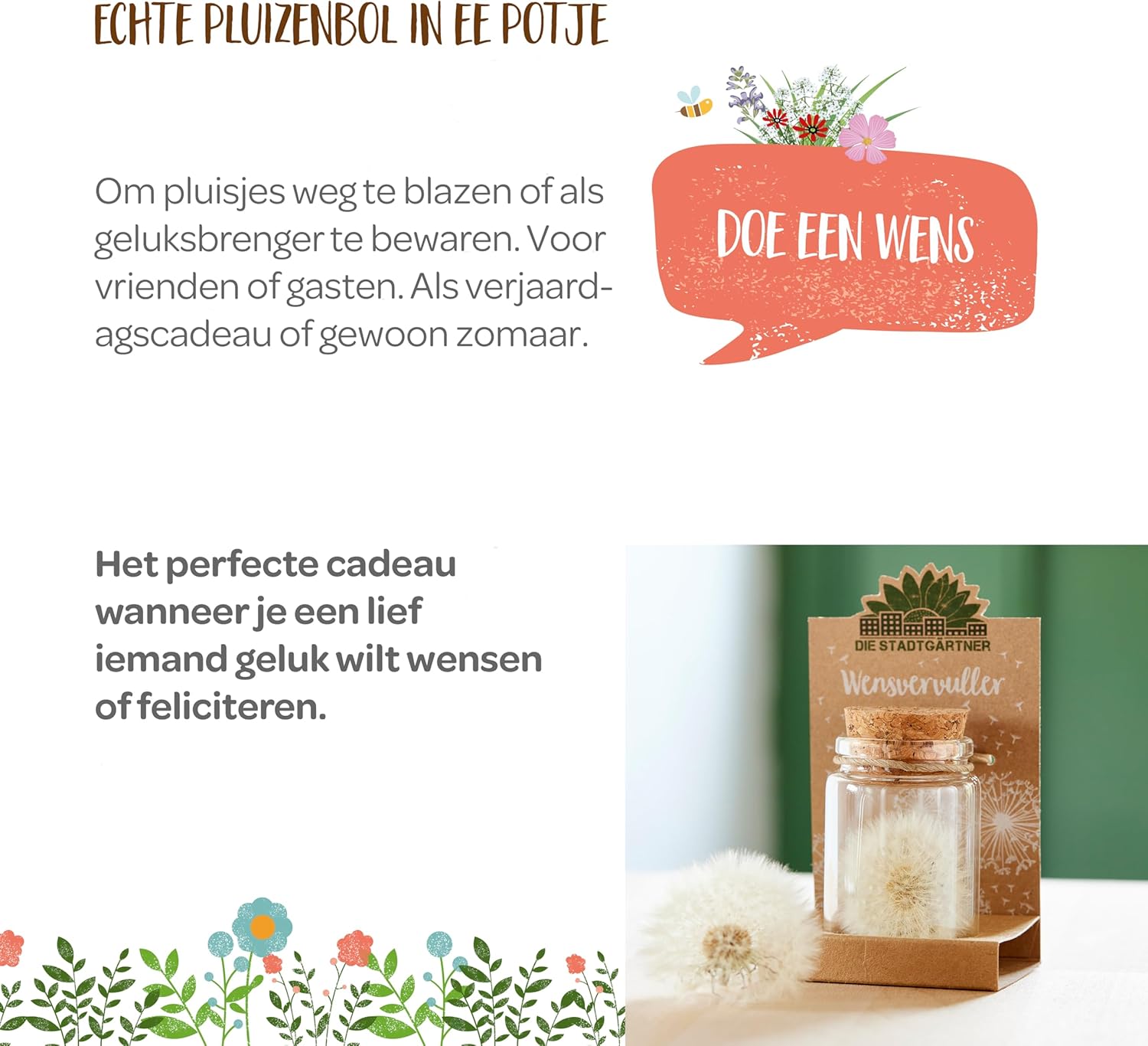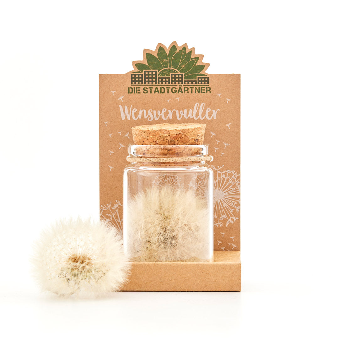 PLUIZENBOL-WENSVERVULLER: Ieder wensvervuller-potje is handgemaakt en bevat een pluizenbol met meer dan 100 wensen! Hij is oneindig houdbaar en zo blijven je wensen voor altijd veilig!